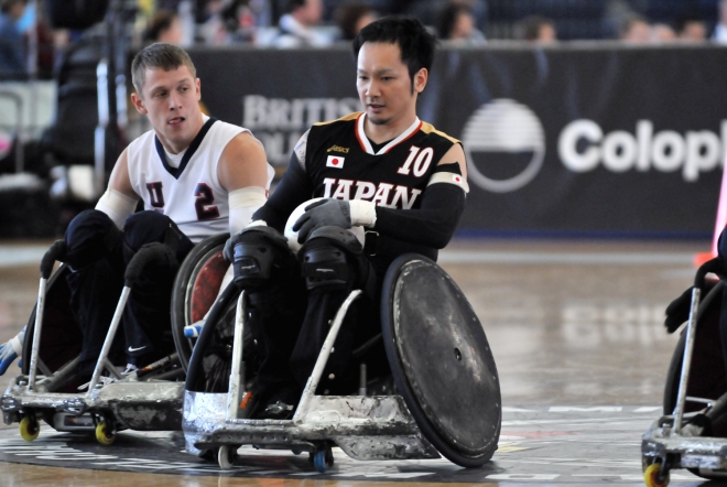 先制した日本は、第1ピリオドから落ち着いた試合運びでUSAに攻撃の形を作らせない。コートを広く使ったパス回し、チェアスキルのある池崎大輔が相手をひきつけ仲里進がゴールするなど素晴らしい組織力と集中力を発揮し、USAに立て続けにタイムアウトを取らせて苦しめる。