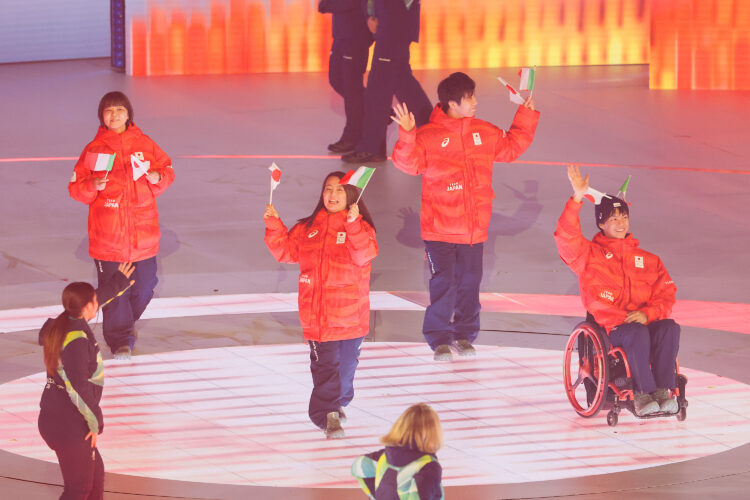 選手団入場では、日本代表はパラアイスホッケーの中村俊介(東京アイスバーンズ)、福西朱莉(同)の両選手と宮崎遼コーチ、役員が日本とイタリアの国旗を振りながら笑顔で行進。その他の選手たちは映像で参加した。