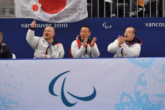 前日に決勝リーグ進出を決めたアイススレッジホッケーの日本代表選手らも応援に駆け付けた