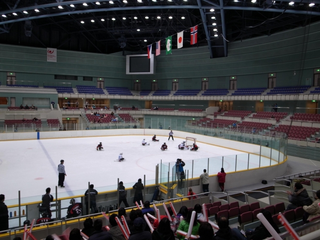 ビッグハットで行われている「2010ジャパンパラリンピックアイススレッジホッケー競技大会」は23日、準決勝が行われた。日本は、予選で完封負けを喫したチェコと対戦。第1ピリオド、チェコに先制点を許した日本は、第2ピリオドに吉川守(FW)のゴールで同点に。試合はもつれ、5分間のオーバータイムでも決着がつかずに、ゲームウイニングショット(GWS)対決へ。日本は1人目の遠藤隆行(DF)が鮮やかにシュートを決め、また日本のGK永瀬充がチェコのシューター3人を完璧にシャットアウトし、勝利に導いた。日本は24日の決勝でアメリカと対戦する。