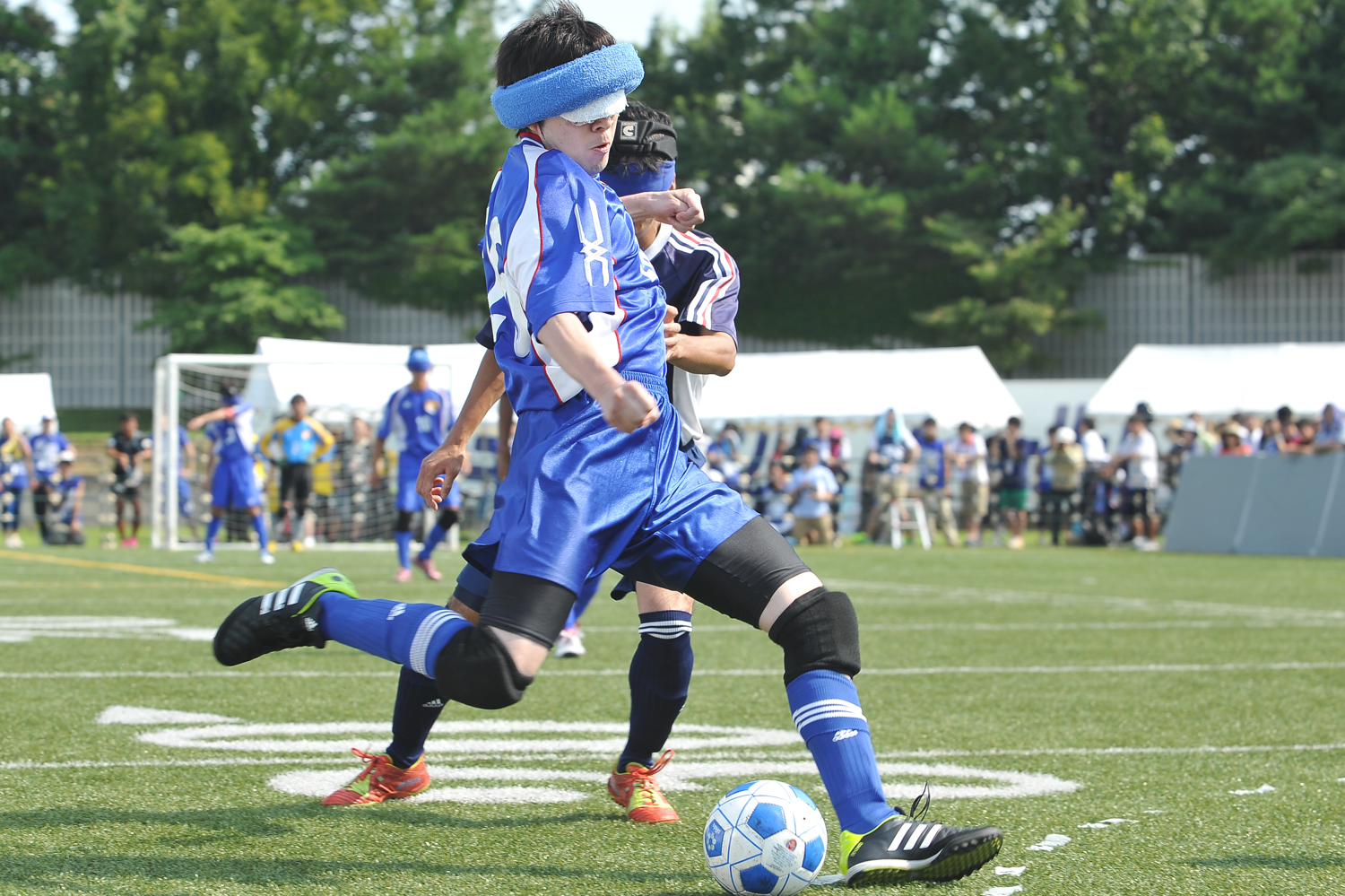 ブラインドサッカーのチーム日本一を決める「第14回アクサブレイブカップ ブラインドサッカー日本選手権」が7月11日、12日の2日間、東京・調布市のアミノバイタルフィールドで開催された。今大会には、新潟フェニックスファイヤーズ、コルジャ仙台FCなど過去最多の14チームが出場。4グループに分かれて総当りのリーグ戦を行い、各リーグの上位チームが決勝トーナメントを戦った。